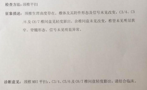回家后发现颈椎持续发出旋转脖子咔咔响有2天时间,于是在家人的陪同下我去人民医院做了核磁共振检查,诊断结果真是出乎意料,没想到颈椎第3-7节全部突出了,还有两节椎间盘轻度膨出,检查结果比我想象中的还要很严重,然后医院就给我切除部分椎板,嘱咐我不要过度久坐,配合医生治疗。