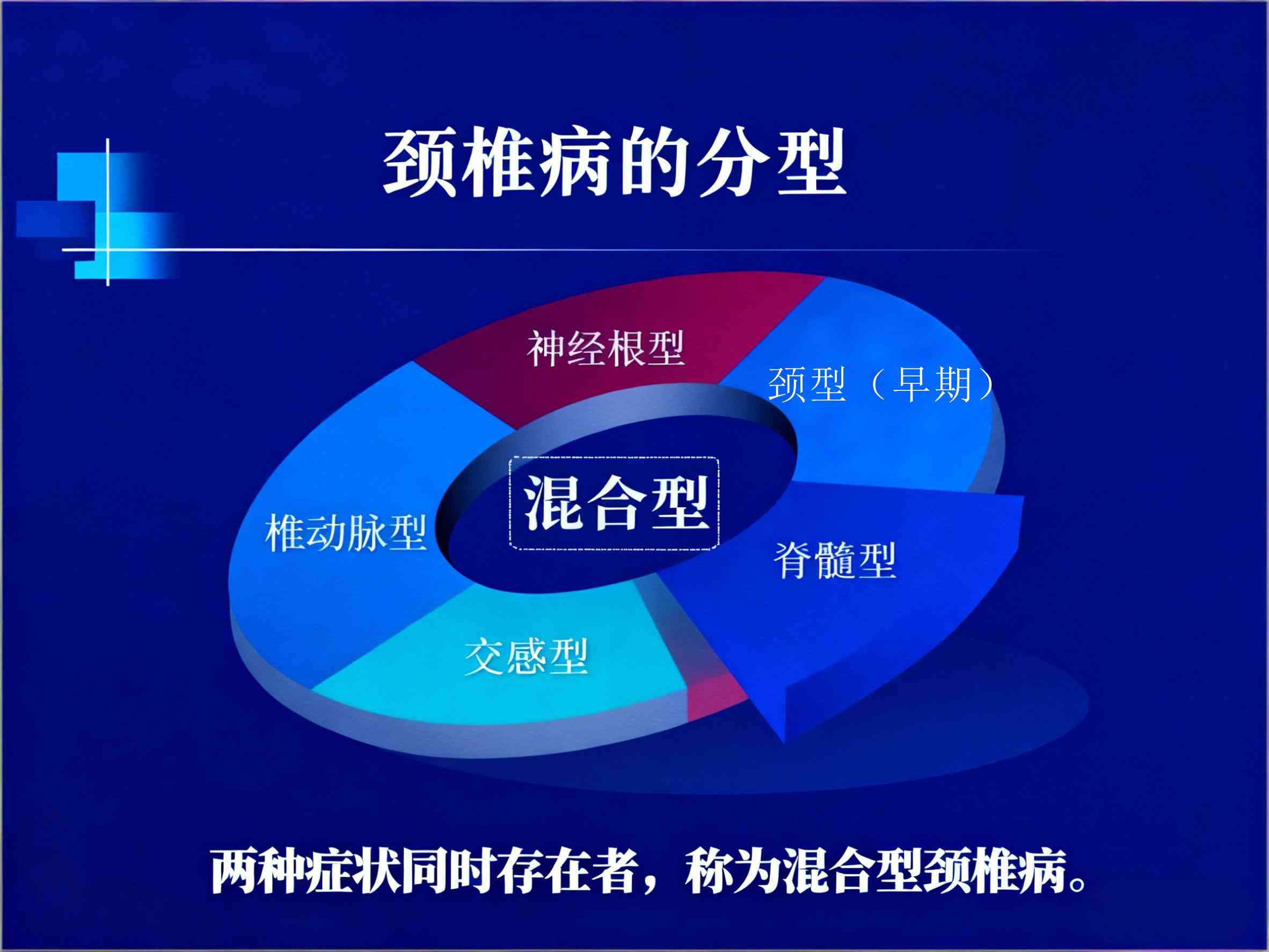 ③.交感神经型颈椎病: 通常伴随椎动脉型颈椎病的症状,另有烦躁失眠、心悸胸闷、血压不稳、疼痛麻木等